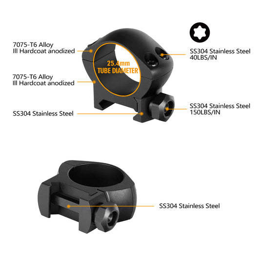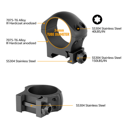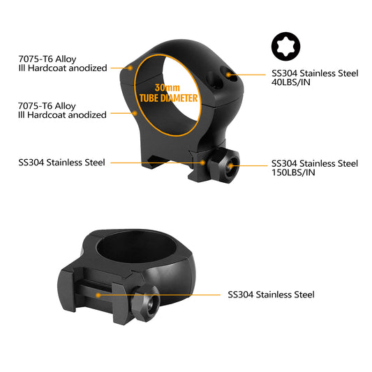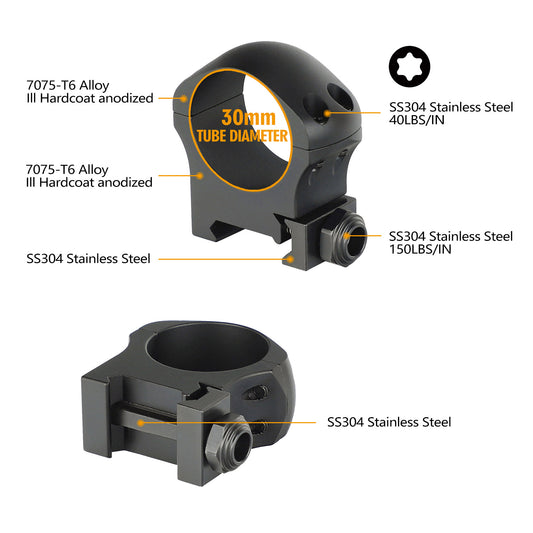 ohhunt® Pro Scope Rings is made from 7075-T6 Aerospace aluminum, it provides greater tensile strength, shear strength, and Brinell hardness, treated with a Type III Hard Anodized Finish for added protection against scratches and blemishing, and comes with SS304 Stainless steel Torx mounting hardware.