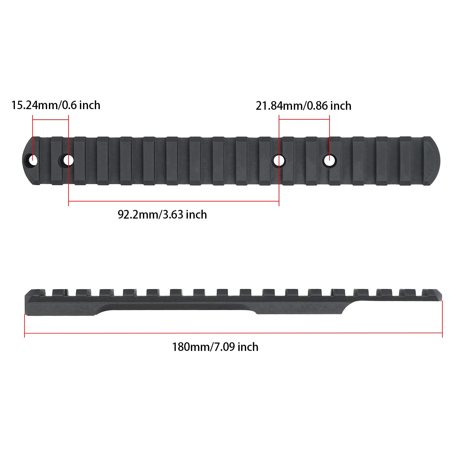 This 0 moa Short Action Remington 700 picatinny rail mount ends circular arc design to reduce sharp edges,17-slots, total length 7.09"/ 180mm. The hole positions are arranged properly, included 2 set screws(#6-48 #8-40). It is machined from 45# Steel and  Manganese Phosphate finished for added protection against scratches and blemishing.