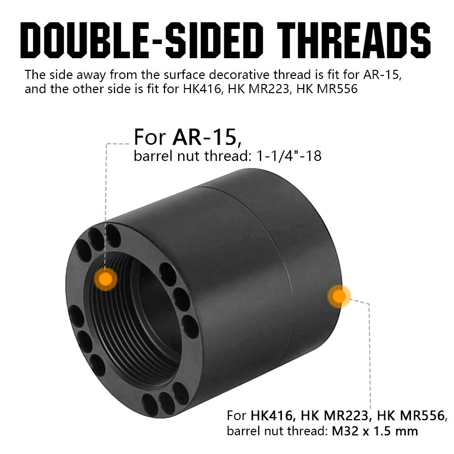 • * The barrel nut come with double-sided threads, the side away from the surface decorative thread is fit for AR-15, and the other side is fit for HK416, HK MR223, HK MR556.