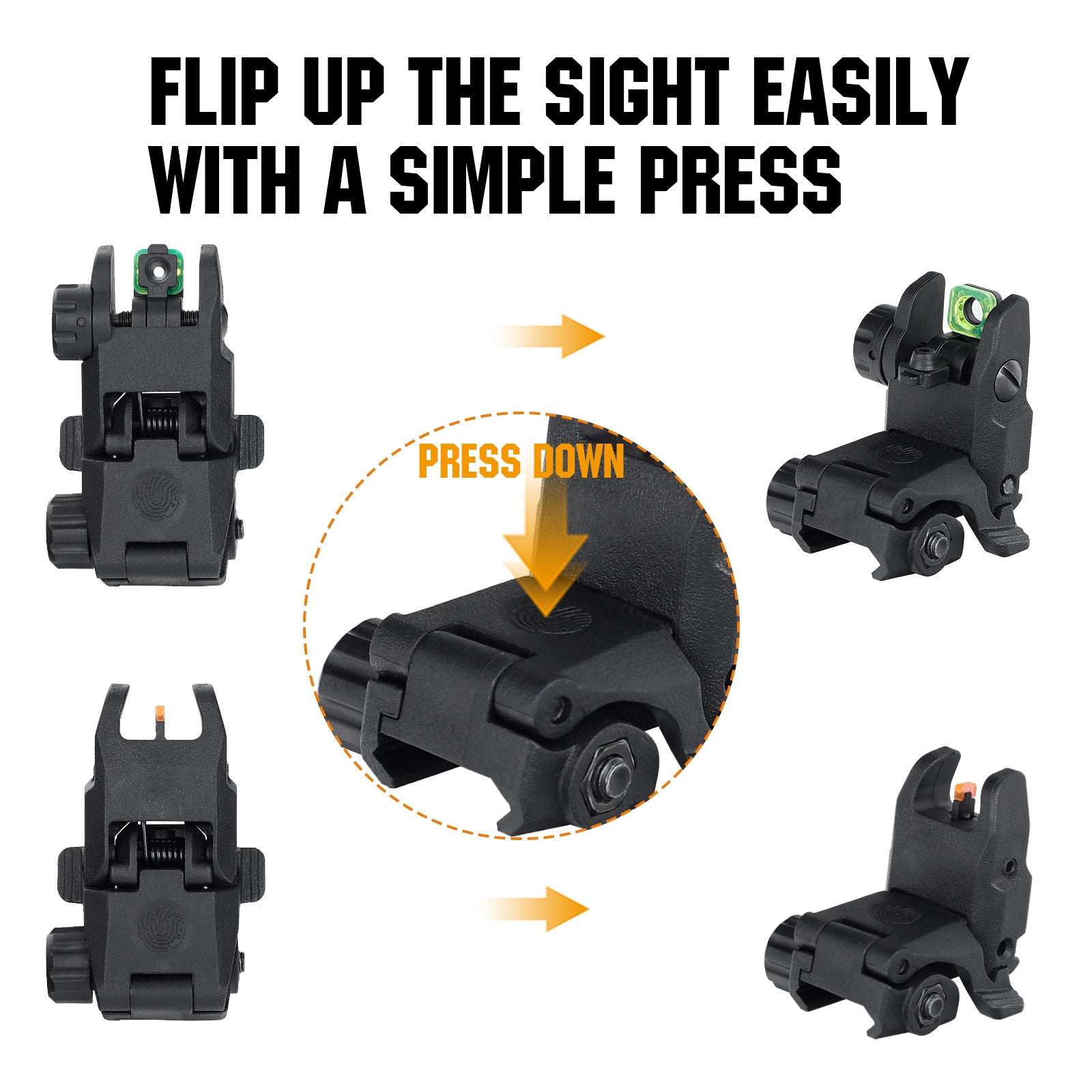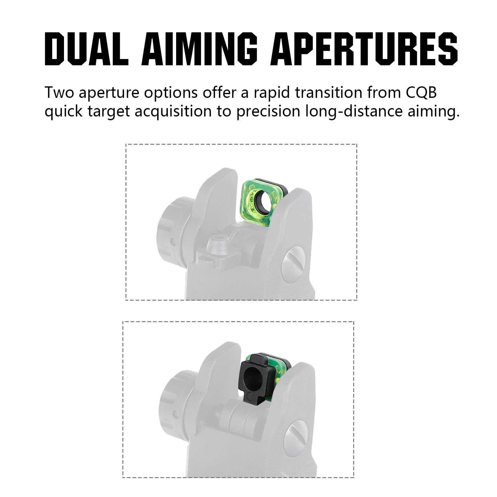 • Quick and Accurate Aiming: The flip-up fiber optic sights features visible front green dot and rear red dots, and the fiber optic provides the brightest aiming point for excellent visibility in daylight or low-light environments, two aperture options offer a rapid transition from cqb quick target acquisition to precision long-distance aiming..